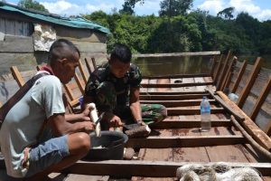 Sintang – Anggota satgas TMMD 109 Kodim 1205/Sintang tertangkap kamera sedang memasak bersama warga di atas kapal pada Sabtu (03/10/2020).