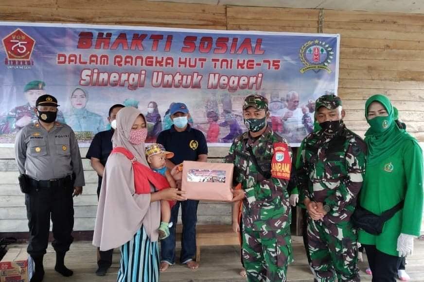 Kayong utara – Masih dalam rangkaian kegiatan memperingati HUT TNI ke-75 tahun 2020, yang bertajuk,” Sinergi Untuk Negeri ” Komando Distrik Militer (Kodim) 1203/Ktp, kali ini Bakti Sosial berlangsung di kawasan yang terdampak banjir, Dusun Harapan Maju Desa Sungai Mata-mata Kec. Simpang Hilir Kab. KKU, Minggu, 4/10/20.