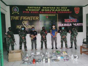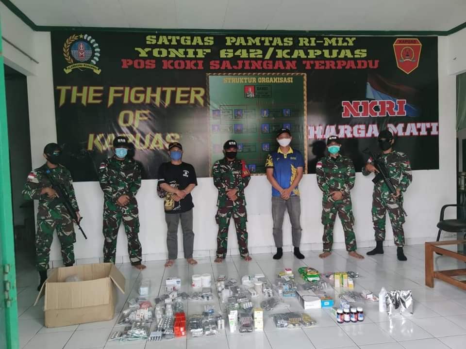 Sambas, Senin (5/10/20) – Personel Satgas Pamtas Yonif 642/Kapuas, Pos Koki Sajingan berhasil mengamankan satu buah kotak berisi obat-obatan ilegal di jalan tikus perbatasan, Kecamatan Sajingan, Kabupaten Sambas, Sabtu malam. Rencananya akan diselundupkan ke Indonesia.