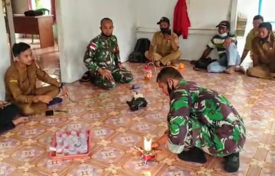 Satgas Pamtas RI-Malaysia Sektor Timur Kalimantan Barat Yonif 407/Padmakusuma sosialisasikan kompor hemat energi berbahan bakar pertalite kepada masyarakat daerah perbatasan yang bertempat di Balai pertemuan desa Sungai Mawang Kecamatan Kapuas Kabupaten Sanggau, Kalbar.(04/10/2020)