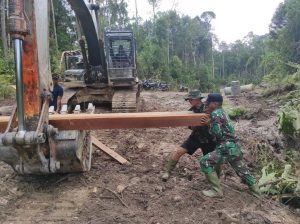 Dihari ke 15 ini tampak Serda Deki antusias membantu proses pekerjaan pembangunan fisik TMMD 109 Sintang ,dengan mengangkat balok besar ditanganya serasa ringan dibuatnya untuk dinaikan ke exsavator kemudian diangkut.