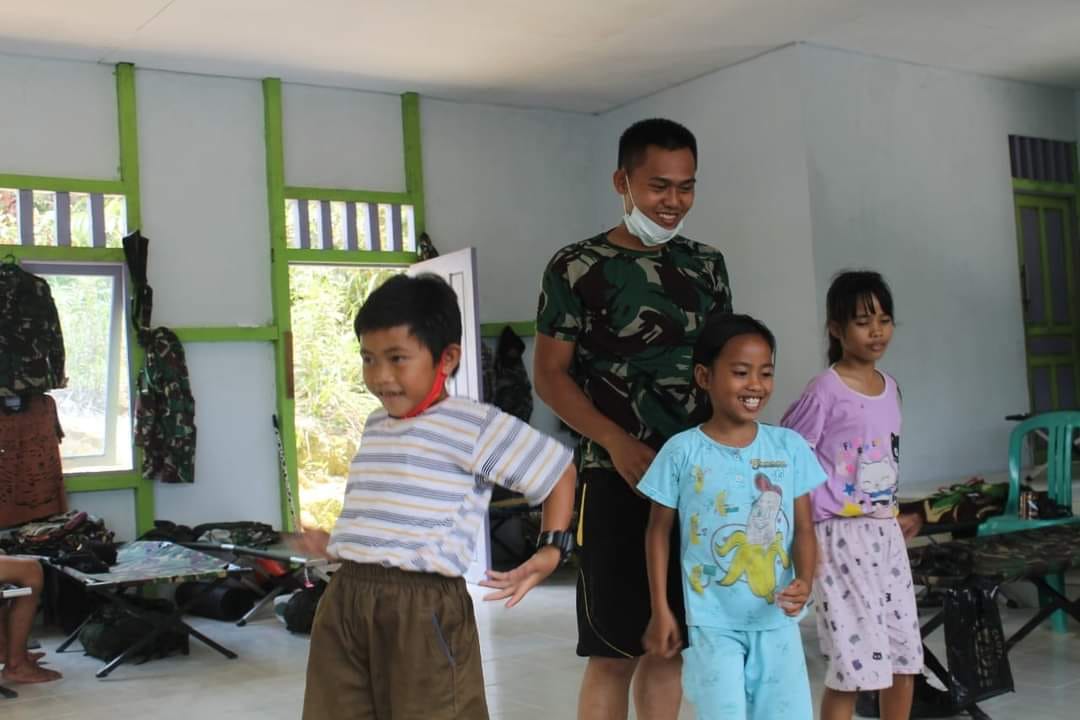 Seperti halnya yang di lakukan oleh Serda Habel salah satu anggota Satgas TMMD 109/Sintang, yang sedang mengajak anak-anak Desa Tirta Karya bermain ke posko Satgas TMMD 109/Sintang sembari mengajarkan tarian tradisional kepada anak-anak.