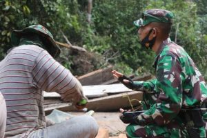 SINTANG – Letkol Inf Eko Bintara Saktiawan selaku Dansatgas terlihat sedang berbincang dengan salah satu anggota tim tukang Satgas TMMD 109/Sintang yaitu Serda Kusmiran, rabu(07/10/2020).