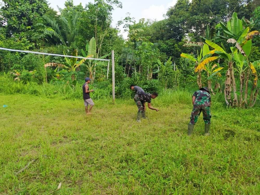 SINTANG – Tidak hanya fokus dalam pembangunan fisik dan non fisik, anggota Satgas TMMD 109/Sintang dengan di bantu warga Dusun Meruai Batu membersihkan lapangan voly yang sudah lama tidak terawat, minggu(11/10/2020).