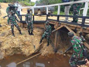 Meskipun sempat diguyur hujan, Tim Wasev Mabesad TMMD ke-109 tetap melanjutkan perjalanan ke sasaran pekerjaan fisik yaitu pembangunan dua unit jembatan dengan ukuran 13 meter x 4 meter dan 4 meter x 4 meter yang terletak di desa sasaran TMMD ke-109 Kodim 1205/Sintang.