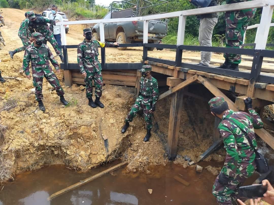 KODIM 1205/SINTANG – Tim Pengawasan dan Evaluasi (Wasev) Mabesad didampingi oleh Kasrem 121/Abw, Kolonel Kav Aloysius Nugroho Santoso., Kasiter Korem 121/Abw, Kolonel Infanteri Daniel Syalom Lalawi meninjau langsung progress pengerjaan fisik pelaksanaan TNI Manunggal Membangun Desa (TMMD) ke-109 Kodim 1205/Sintang, Rabu (14/10/2020).