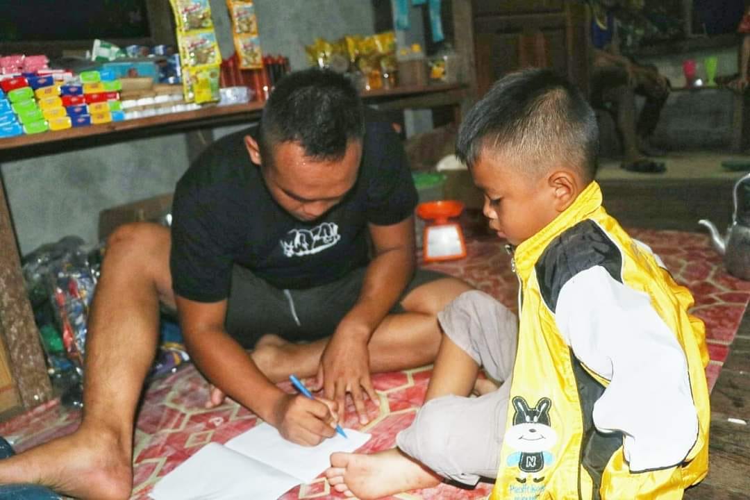 Serda Yosua yang merupakan Anggota Satgas TMMD-109 Kodiim 1205/Sintang dengan ketulusan hati terlihat sedang membimbing Fajar salah satu Anak SD (Sekolah Dasar) di Desa Tirta Karya Kecamatan Ketungau Tengah Kabupaten Sintang yang sedang bejar di rumahnya.