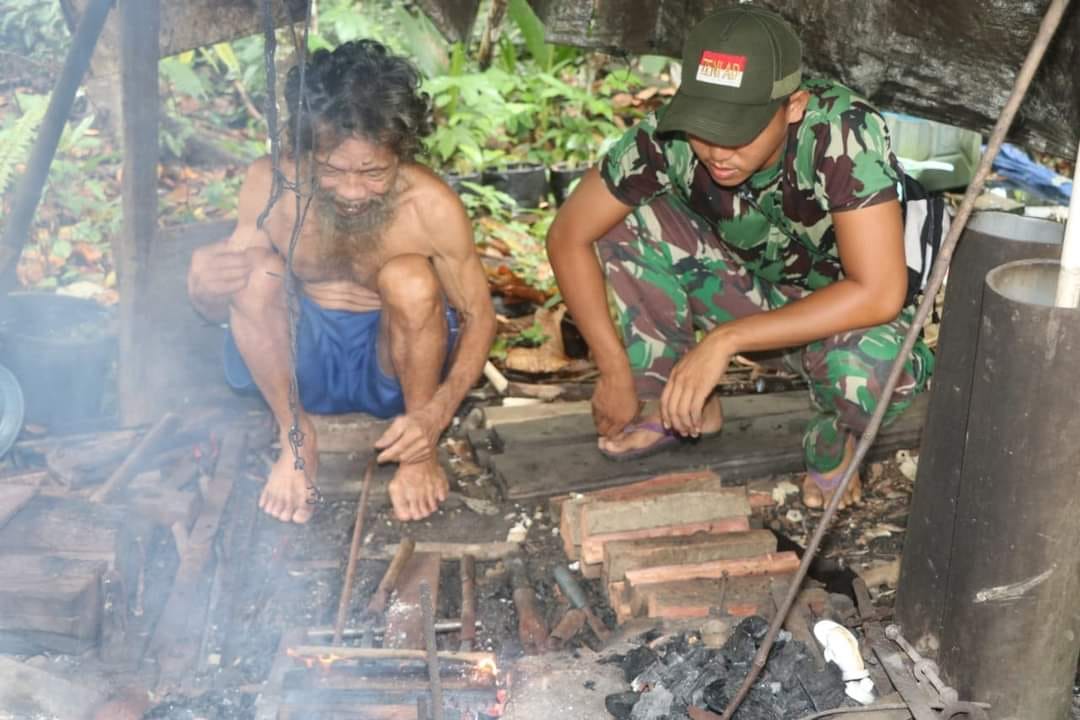 Sintang – Anggota satgas TMMD 109 Kodim 1205/Sintang melihat sambil belajar bagaimana cara nempak mandau, Senin (12/10/2020).