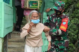 Serda Iskandar yang merupakan Anggota Satgas TMMD-109 Kodim 1205/Sintang melihat kejadian itu langsung bembantu nenek Apung Moi menurunkan tangga rumah serta mengiringi nya.