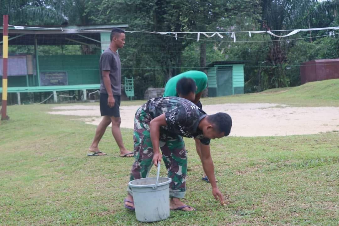 Serda Cundang bersama rekan rekannya yg lain terlihat bersemangat membersihkan pangkalan Koramil 09 Nanga Merakai tersebut.