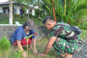 Sintang – Anggota satgas TMMD 109 Kodim 1205/Sintang terlihat sedang membantu salah satu warga yg sedang membersihkan halaman rumahnya, Jumat (16/10/2020).