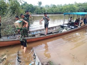 Tampak Tampak Tim Satgas TMMD 109 Sintang berangkut sarana dan prasarana menggunakan long boat. (1205/Sintang)