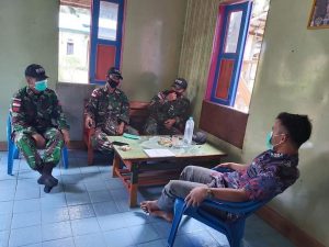 Sambas – 21/10/2020 Serda Irawan Nugroho Aji bersama 3 anggota Pos Koki Sajingan Terpadu Satgas Yonif 642/Kps melaksanakan Anjangsana ke rumah Bapa Natalaius yang merupakan Bapak Kadus di Dsn. Aruk, Ds. Sebunga Kec. Sajingan, Kab. Sambas.