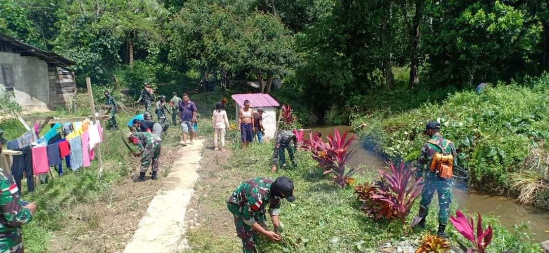 Sanggau – Guna menumbuhkan semangat gotong royong dan kebersamaan di lingkungan masyarakat perbatasan. Satgas Pamtas Yonif 642/Kapuas, Pos Sei Daun melaksanakan karya bhakti pembersihan fasilitas umum di Dusun Kuyak, Desa Lubuk Sabuk, Kecamatan Sekayam, Kabupaten Sanggau, Selasa (20/10/20)