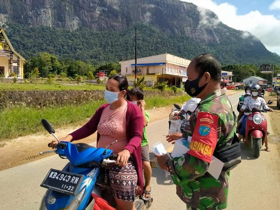 Saling peduli terhadap sesama ditunjukan anggota Koramil Kelam beserta instansi terkait dengan membagikan masker kepada warga, hal ini bertujuan untuk memutus matarantai penularan virus Covid-19.