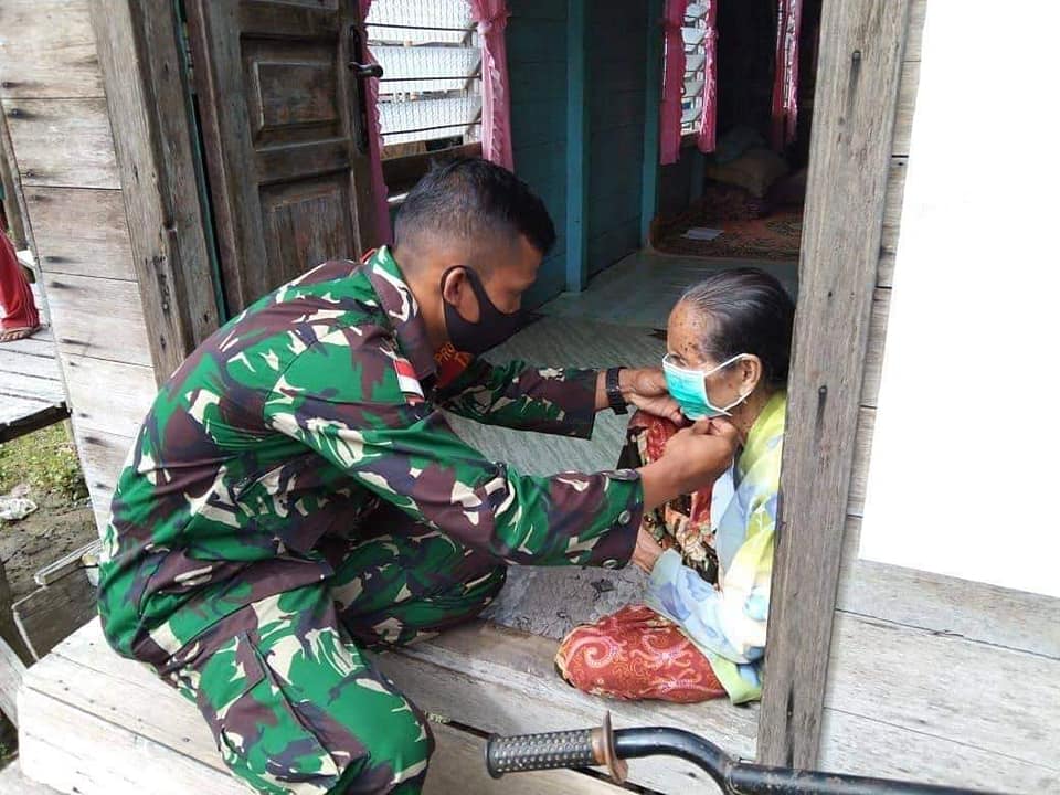 Langkah pencegahan penularan dan pemutusan mata rantai penyebaran virus corona (Covid-19) dilakukan Bintara Pembina Desa (Babinsa) jajaran KODIM 1206/PSB membagi-bagikan masker kepada warga dan setiap pengguna jalan yang melintas di depan Makoramil nya masing-masing dan di desa binaan nya masing-masing.