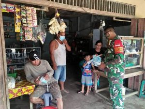 Landak – Danramil 07/Karangan Kapten Inf Ceng Deding menyosialisasikan penggunaan masker dan membagikan masker gratis kepada masyarakat, Selasa (10/11/2020).