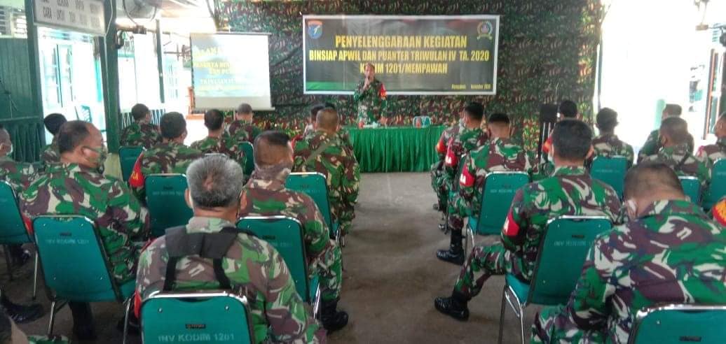 Mempawah – Kodim 1201/Mph menggelar kegiatan pembinaan kesiapan aparat kewilayahan dan kemampuan teritorial (Binsiap Apwil dan Puanter) Triwulan IV Tahun Anggaran 2020, di aula Makodim, Rabu (11/10/2020).