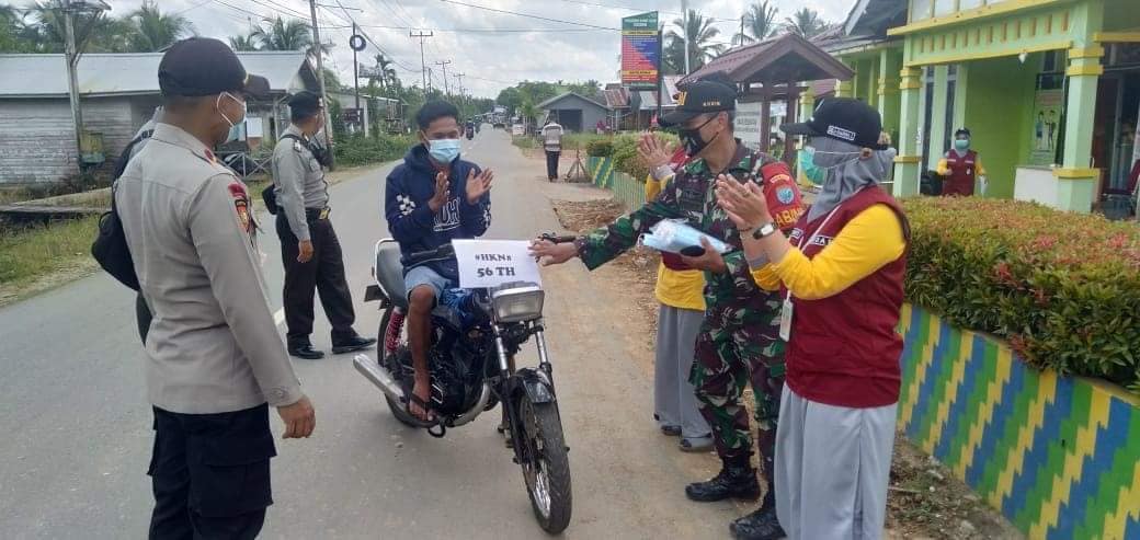 Dalam rangka memperingati Hari Kesehatan Nasional yang ke 56 Tahun 2020, Koramil 1201-01Jungkat, bersama instansi terkait membagikan masker secara serentak kepada masyarakat di Segedong, Kamis (12/11/2020).