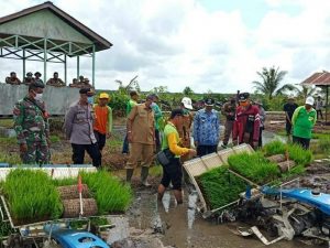 Ketapang – Babinsa Koramil-12/MHU Koptu Hamka Makatita dampingi kelompok tani melaksanakan penanaman padi bersama di lahan percontohan Desa Kuala Satong Kecamatan MHU Kabupaten Ketapang, Rabu (18/11/2020).