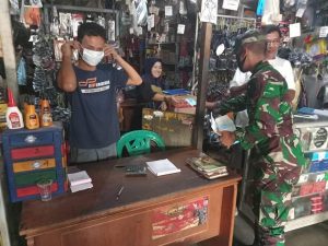 SINTANG – Dalam upaya memutus mata rantai virus covid-19, Koramil 1205-15/Sokan bersama aparat pemerintah desa terus bagikan masker kepada warga.
