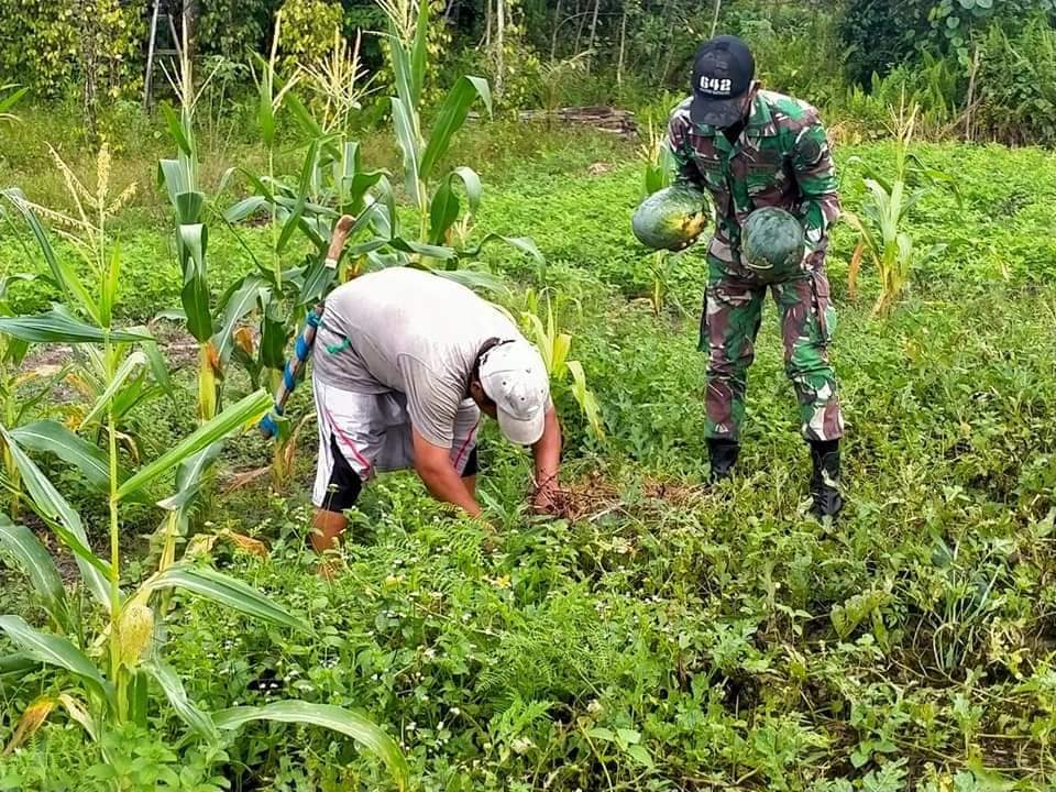 Satgas Pamtas RI-MLY Yonif 642/Kps Pos Temajuk membantu warga melaksanakan panen buah dan sayur di Dusun Maludin, Desa Temajuk, Kecamatan Paloh, Kabupaten Sambas.
