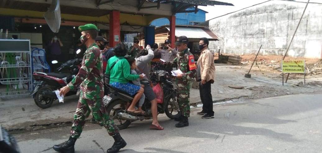 Mempawah – Koramil Sungai Pinyuh bersama Muspika setempat membagikan 600 lembar masker untuk masyarakat Kecamatan Anjungan, Kabupaten Mempawah. Di pasar, Jalan raya dan pertokoan. Kamis (26/11/2020) pagi.