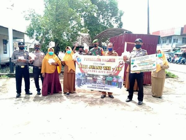 Mempawah – Koramil Sungai Kunyit Membagikan 350 lembar masker untuk memeriahkan Hari Juang TNI AD di Desa Semudun, Selasa (15/12/2020).