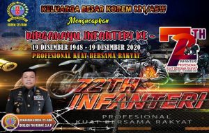 KELUARGA BESAR KOREM 121/ABW MENGUCAPKAN DIRGAHAYU INFANTERI KE-72 19 Desember 2020 oleh Redaksi Korem 121/abw KELUARGA BESAR KOREM 121/ABW MENGUCAPKAN DIRGAHAYU INFANTERI KE-72