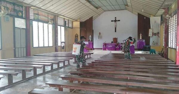 SANGGAU – Koramil 1204-19/Mukok, Melaksanakan Pengecekan Protokol Kesehatan dan Penyemprotan Disinfektan di gereja yang melaksanakan Perayaan Natal Tahun 2020.