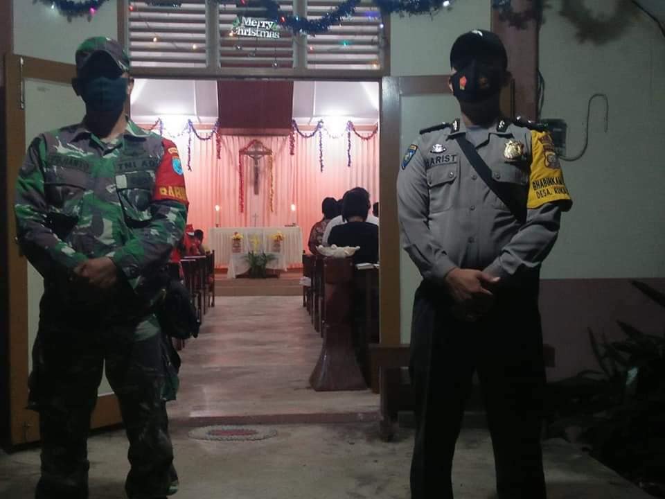 Bengkayang – Guna memberikan rasa Nyaman dan aman bagi saudara kita Umat Kristiani yang melaksanakan ibadah Misa Natal, Babinsa Koramil 1202-03/Sungai Raya bersama Polsek Sungai Raya dan komponen masyarakat lainnya melaksanakan Pengamanan jalannya Misa Natal Tahun 2020 di gereja yang ada di wilayah Koramil 1202-03/Sungai Raya, Kamis (24/12/20).
