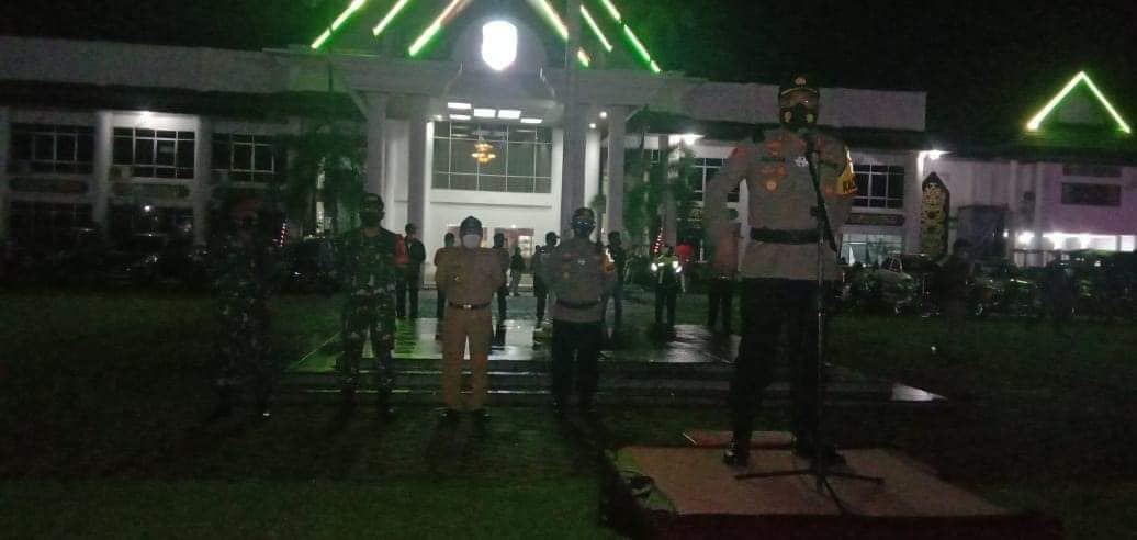 Mempawah – Personil Kodim 1201/Mph mengikuti apel gabungan dalam rangka patroli dan pengamanan tahun baru 2021 di Lapangan Kantor Bupati Mempawah, Kamis (31/12/2020) malam.