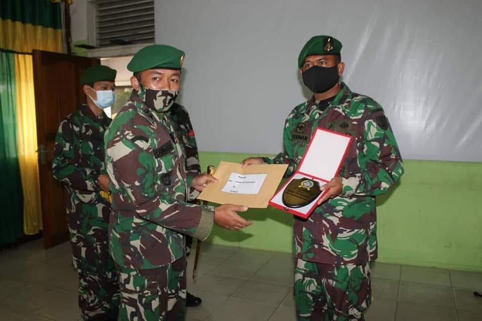 Upacara Korps Raport Penerimaan dan Pelepasan Personel diakhiri dengan penyerahan Piagam dan Cenderamata almamater Kodim 1203/Ktp dan ucapan selamat kepada personel.