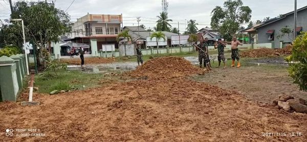 Mempawah – Personil Koramil Jungkat bersama masyarakat melaksanakan gotong royong memperbaiki taman di halaman depan kantor Koramil Jungkat, Jumat (15/1/2021).