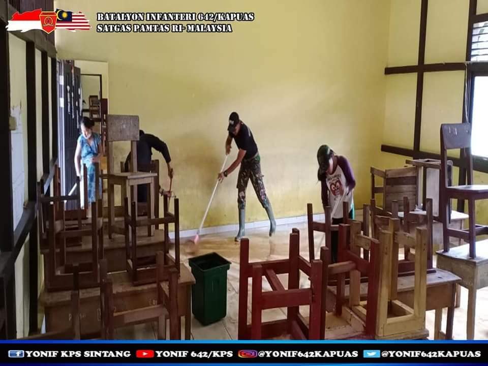 Bengkayang, Kalbar – Anggota Pos Kout Jagoi Babang Satgas Pamtas Yonif 642/Kps, dipimpin Serda Yohan Madu bersama 5 orang anggota lainnya bersama masyarakat, gotong royong membersihkan kotoran yang terbawa banjir di lingkungan SDN 1 Jagoi Babang, Desa Jagoi Babang, Kecamatan Jagoi Babang, Kabupaten Bengkayang, Kalimantan Barat.