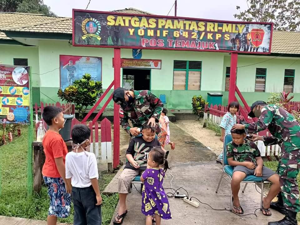 Sambas, Kalbar – Pos Temajuk Satgas Pamtas Yonif 642/Kps diserbu anak-anak Dusun Maludin, Desa Temajuk, Kec. Paloh, Kab. Sambas, Kalbar. Tujuan kedatangan anak-anak tersebut adalah untuk meminta personel Satgas memangkas rambut mereka.