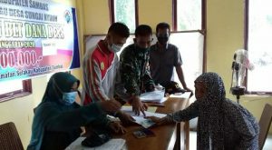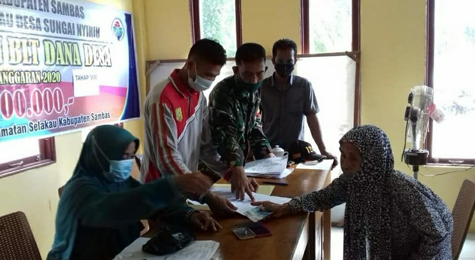 Sambas, Babinsa Sungai Nyirih Serda Supiaji melaksanakan pengawalan dalam penyaluran program BLT Tahap 8 untuk membantu ekonomi warga yang terkena dampak dari pandemi virus Covid-19 sehingga penyalurannya tepat pada sasaran, Selasa, (19/1/2021).