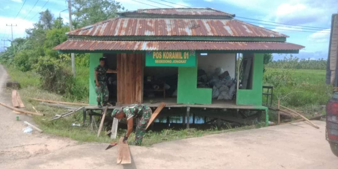 Mempawah – Danramil Jungkat Kapten Arm. Buntoro Nugroho bersama sejumlah anggotanya melakukan pembenahan Posko Babinsa di Dusun Tani Makmur, Desa Peniti Besar, Kecamatan Jungkat, Kabupaten Mempawah, Selasa (2/2/2021).