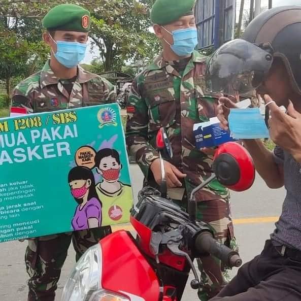 Dikatakan Pasiops Kodim 1208/Sambas Lettu Inf S.P Sitinjak saat memimpin membagikan masker secara gratis kepada masyarakat di Tugu Tabrani Simpang Lampu Merah Kota Sambas,Selasa (2/2/2021)