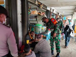Mempawah – Babinsa Koramil 1201-04/Sungai Kunyit Serda Hamdani meminta masyarakat yang beraktifitas di Pasar Semudun untuk selalu menggunakan masker.