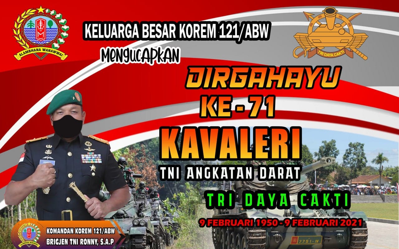 KELUARGA BESAR KOREM 121/ABW MENGUCAPKAN “DIRGAHAYU KE-71 KAVALERI TNI AD” TRI DAYA CAKTI 9 Februari 1950- 9 Februari 2021 9 Februari 2021 oleh Redaksi Korem 121/abw KELUARGA BESAR KOREM 121/ABW MENGUCAPKAN “DIRGAHAYU KE-71 KAVALERI TNI AD” TRI DAYA CAKTI 9 Februari 1950- 9 Februari 2021