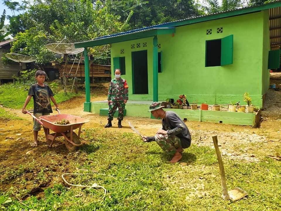 Landak – Koramil Sengah Temila mulai melaksanakan pembersihan Rumah Tak Layak Huni (RTLH) milik Seselia yang telah selesai direnovasi.