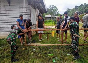 Kegiatan karya bakti ini dilakukan secara gotong royong oleh empat personel Pos Kampung Jasa yang dipimpin Kopda Eko bersama dengan warga setempat, selain membuat pagar balai desa, mereka juga melaksanakan pembersihan rumput dan sampah sekitar balai desa.