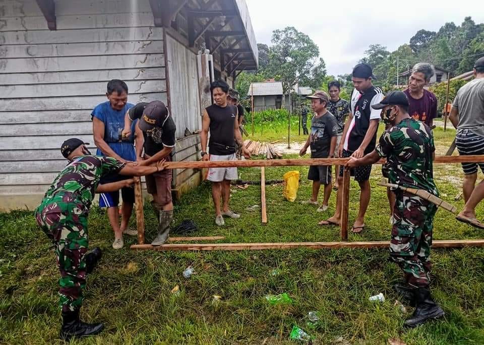 Satgas Pamtas RI-Malaysia Yonif 407/PK bersama masyarakat melaksanakan karya bakti Pembuatan pagar di Balai Desa Jasa, Dusun Wakampuh, Desa Jasa, Kecamatan Ketungau Hulu, Kabupaten Sintang, Kalbar.