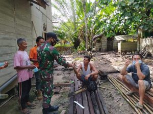 Landak – Koramil Serimbu membagikan masker kepada warga Dusun Serimbu Seberang, Desa Serimbu, Kabupaten Landak.
