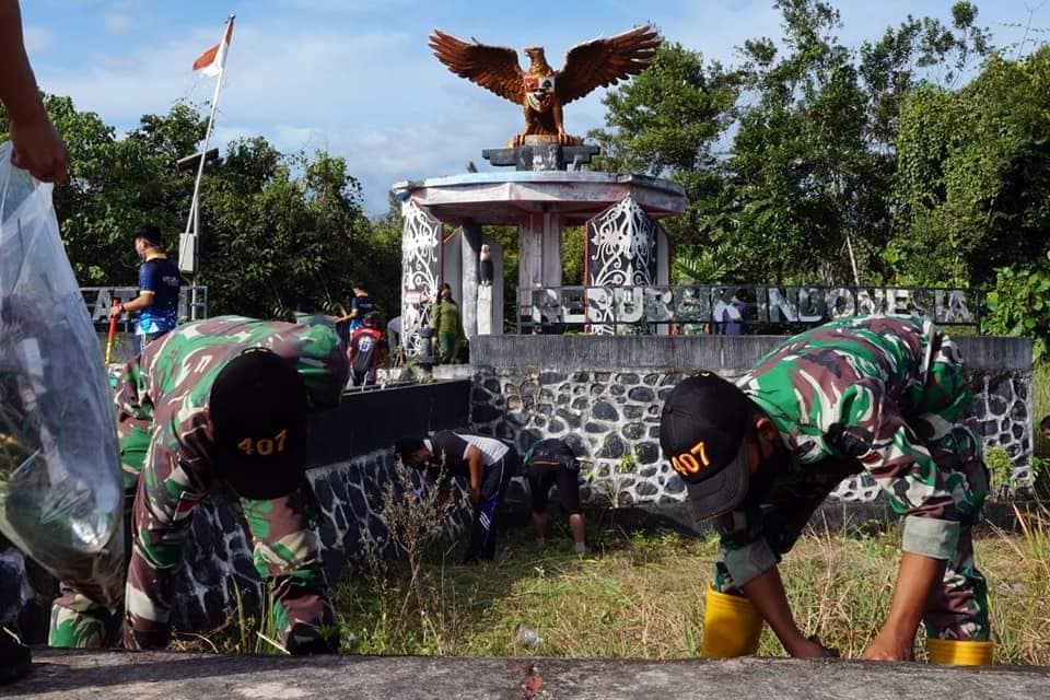 Satgas Pamtas RI-MLY Yonif 407/PK bersama Muspika Kecamatan Badau, CIQ (Custom, Imigrasi, Quarantina), serta masyarakat melaksanakan kegiatan kerja bhakti membersihkan areal sekitar Tugu Kedaulatan Republik Indonesia di Simpang Tiga PLBN Badau Jl. lintas Utara Dusun Berangan, Desa Janting, Kecamatan Badau, Kabupaten Kapuas Hulu, Kalbar. Jumat (12/02/2021)