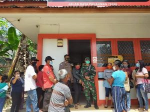 Landak – Babinsa Sengah Temila, Prada Delu Pandaras bersama Bhabinkamtibmas setempat mendampingi penyaluran Bantuan Sosial Tunai (BST) dari Kementerian Sosial di Kantor Pos Pahauman, Sabtu (13/2/2021).