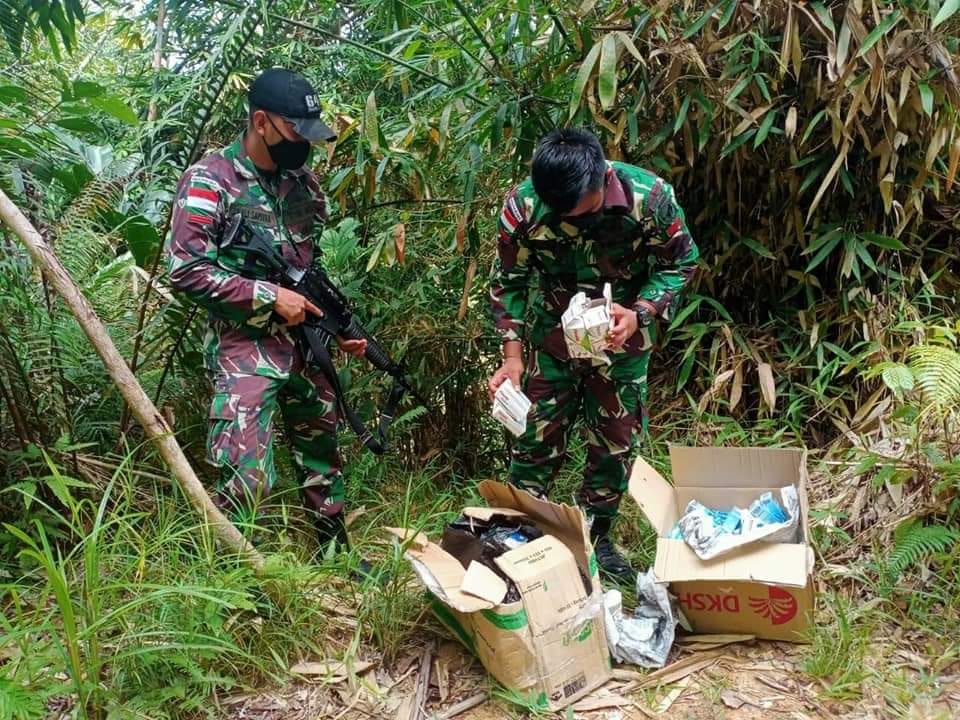 “Ketika melaksanakan patroli dan penyisiran di jalur tikus, ditemukan dua kotak kardus yang disembunyikan dibalik semak-semak,” ungkap Dansatgas.