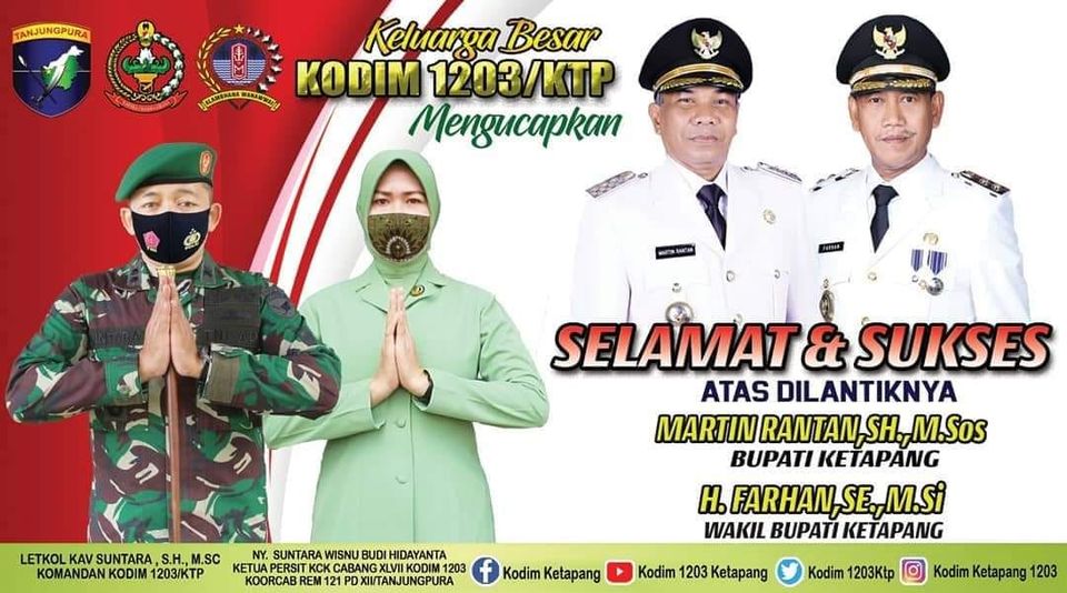 Ketapang – Dandim 1203/Ktp, Letkol Kav. Suntara Wisnu Budi Hidayanta SH.,M.Sc dan Ketua Persit KCK Cabang XLVII Kodim 1203, Ny. Suntara Wisnu Budi Hidayanta beserta keluarga besar Kodim 1203/Ktp mengucapkan selamat dan sukses atas dilantiknya Bapak Martin Rantan, S.H.,M.Sos., sebagai Bupati Kab. Ketapang dan Bapak H.Farhan S.E.,M.Si sebagai Wakil Bupati Kab. Ketapang.