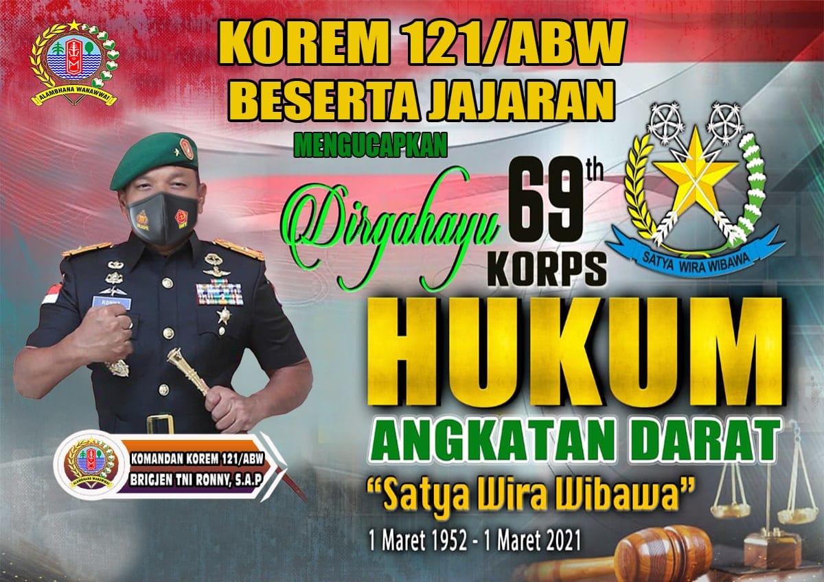 KOREM 121/Abw Beserta Jajaran Mengucapkan Dirgahau ke 69 Korp HUKUM Angkatan Darat. “Satya Wira Wibawa” 1 Maret 2021 oleh Redaksi Korem 121/abw